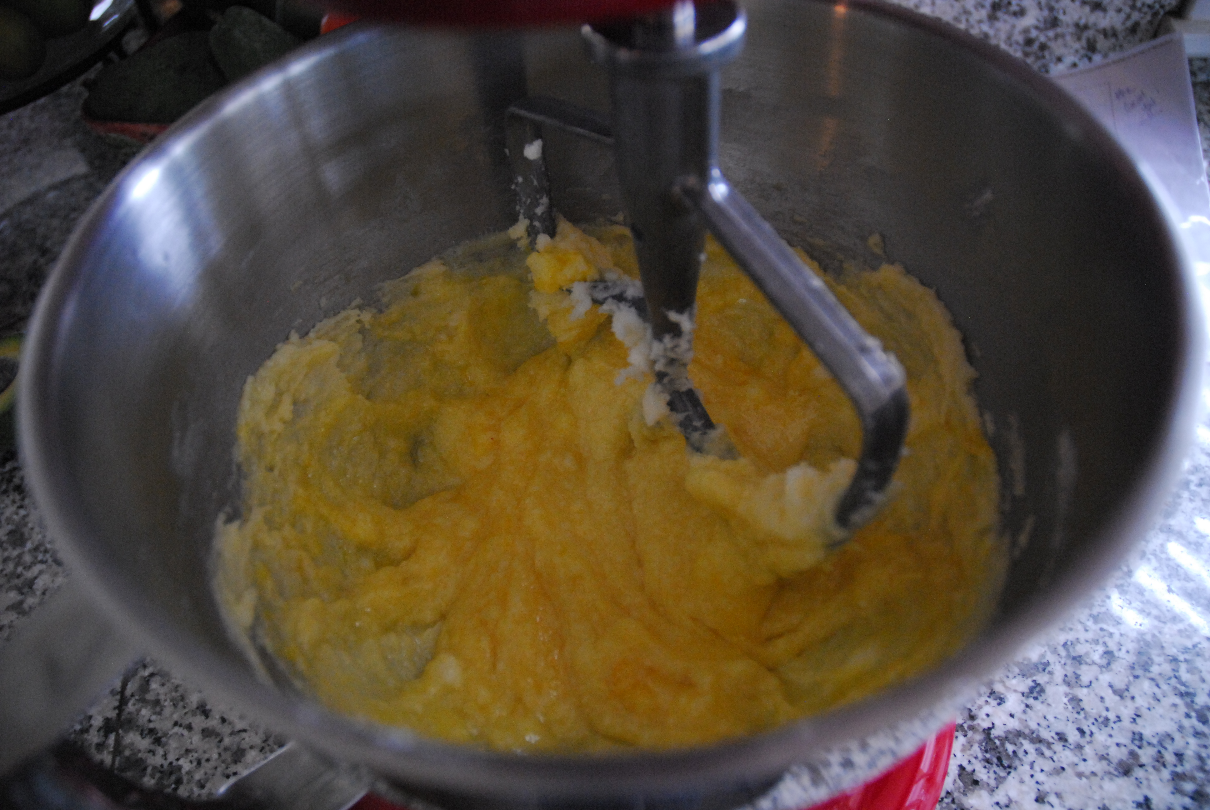 Add mashed bananas and beat (I have to admit that I don’t actually pre-mash the bananas. I just peel them and smoosh them with my bare hands before throwing them in the mixing bowl).