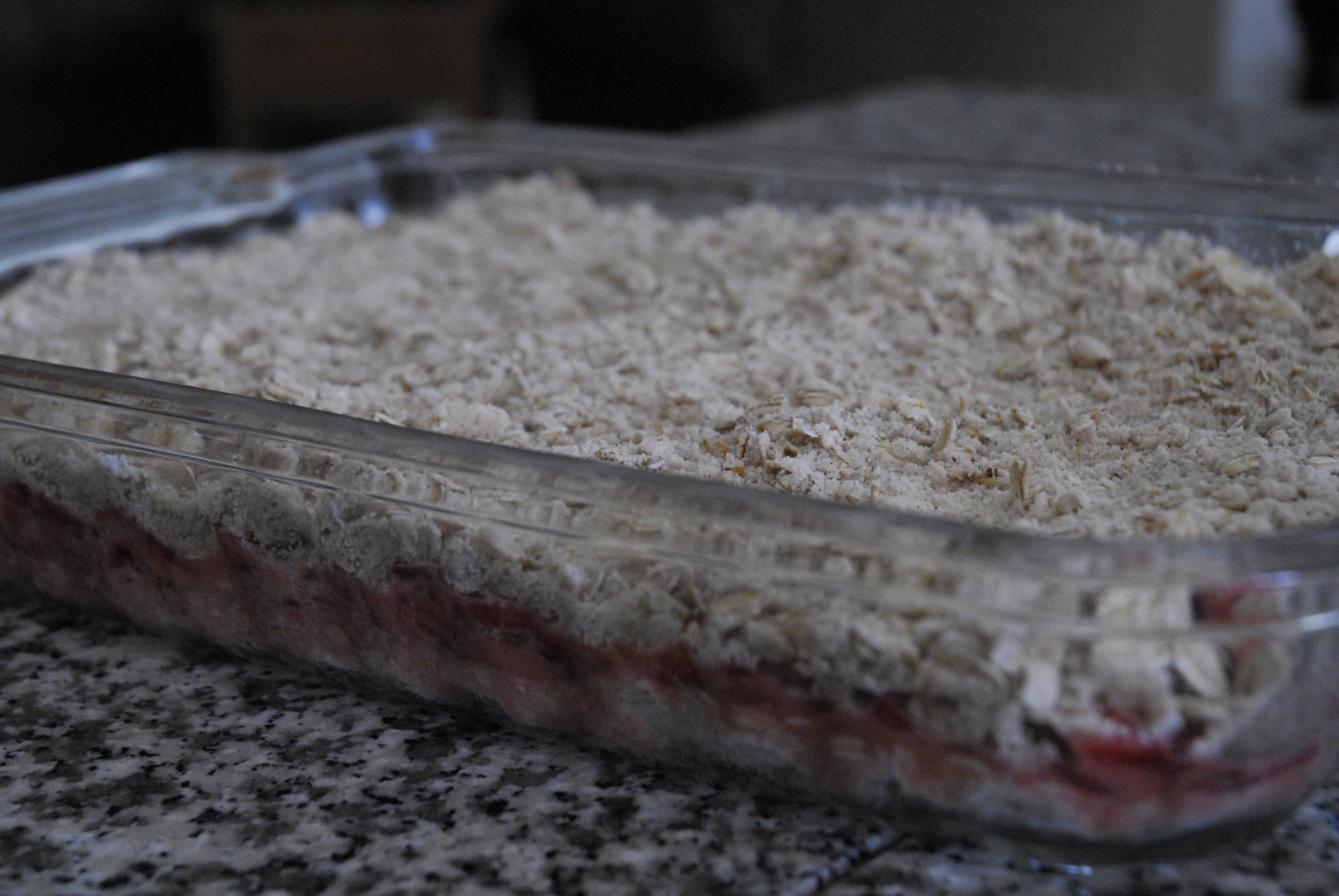 Press 2/3 of the crust mixture into the bottom of the prepared baking dish. Spread the strawberry filling evenly over the top of the crust. Sprinkle the remaining crust mixture over the top of the filling, creating a crumb-like topping.