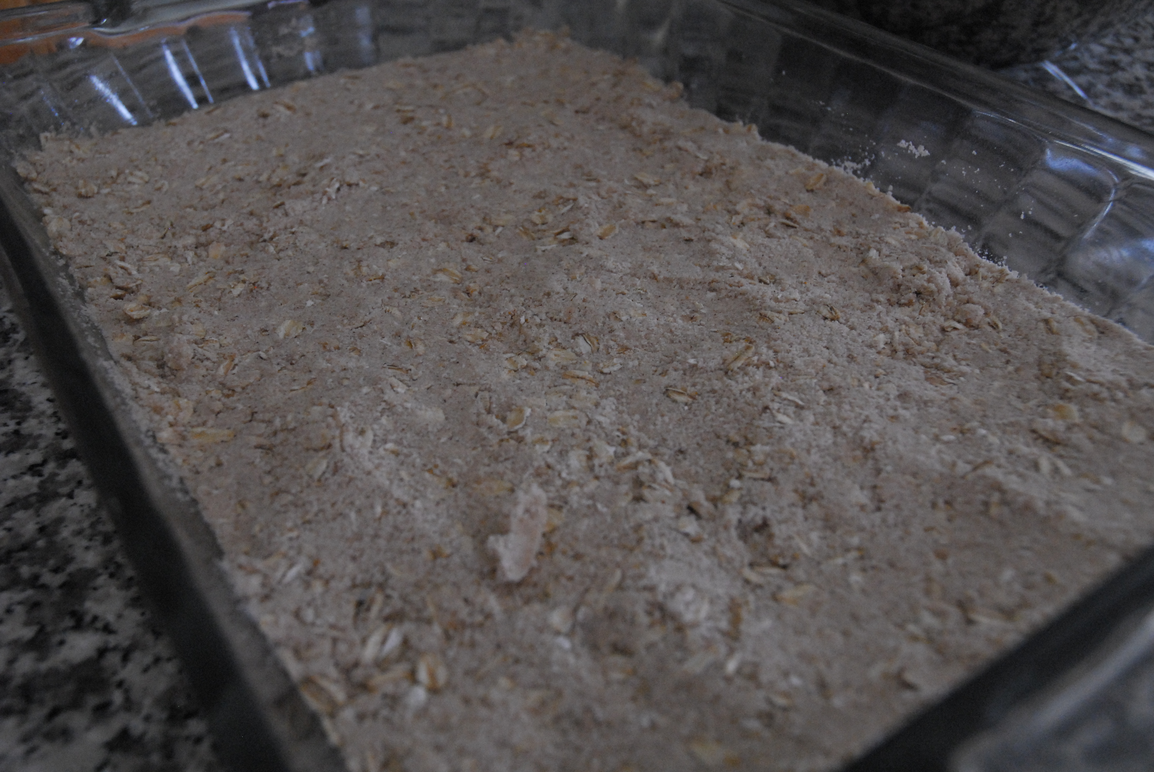 Press 2/3 of the crust mixture into the bottom of the prepared baking dish.