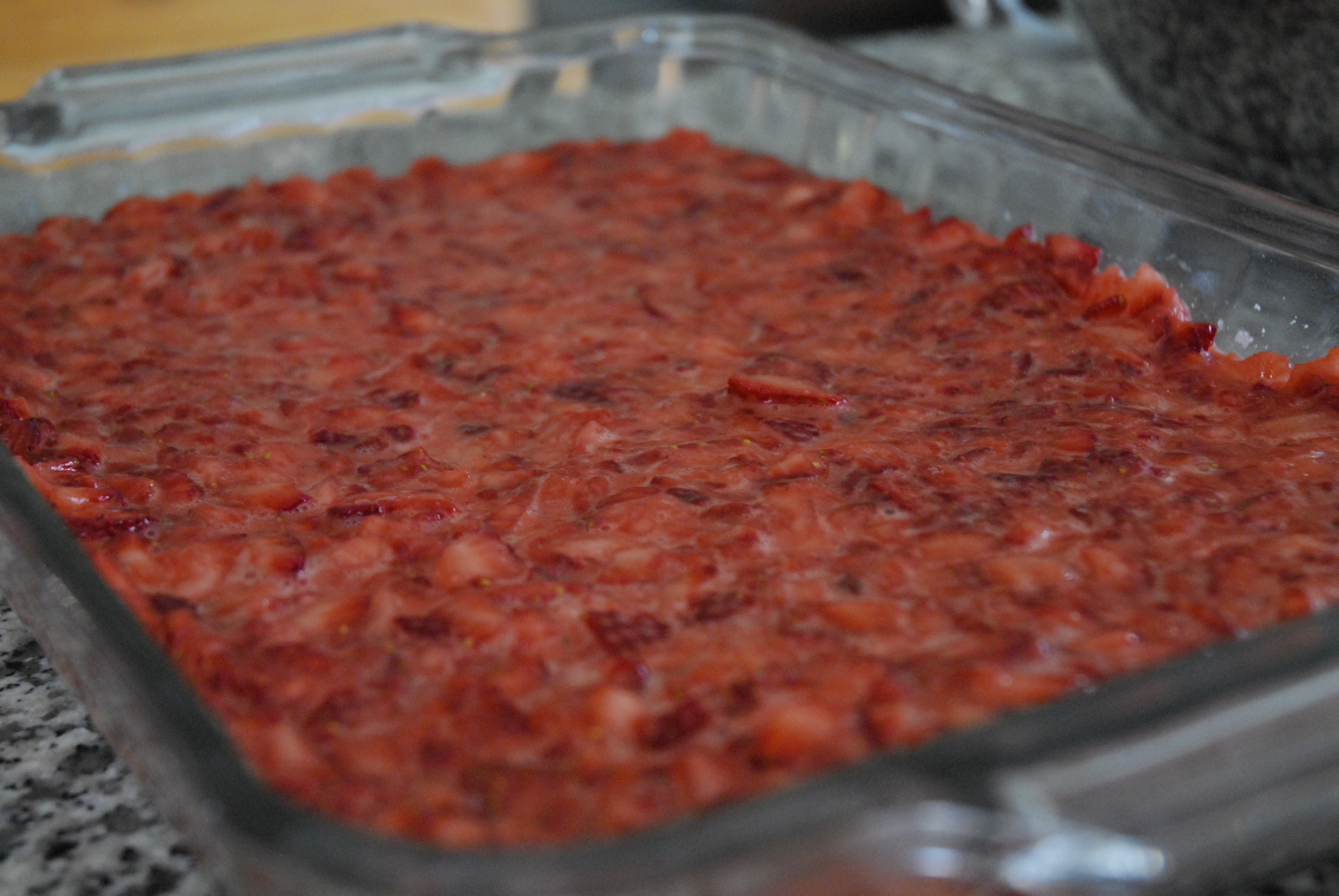 Preheat oven to 325*. Grease a 9″x13″ baking pan and set aside. In a large bowl, stir together strawberries and sugar and let sit for 10 minutes.