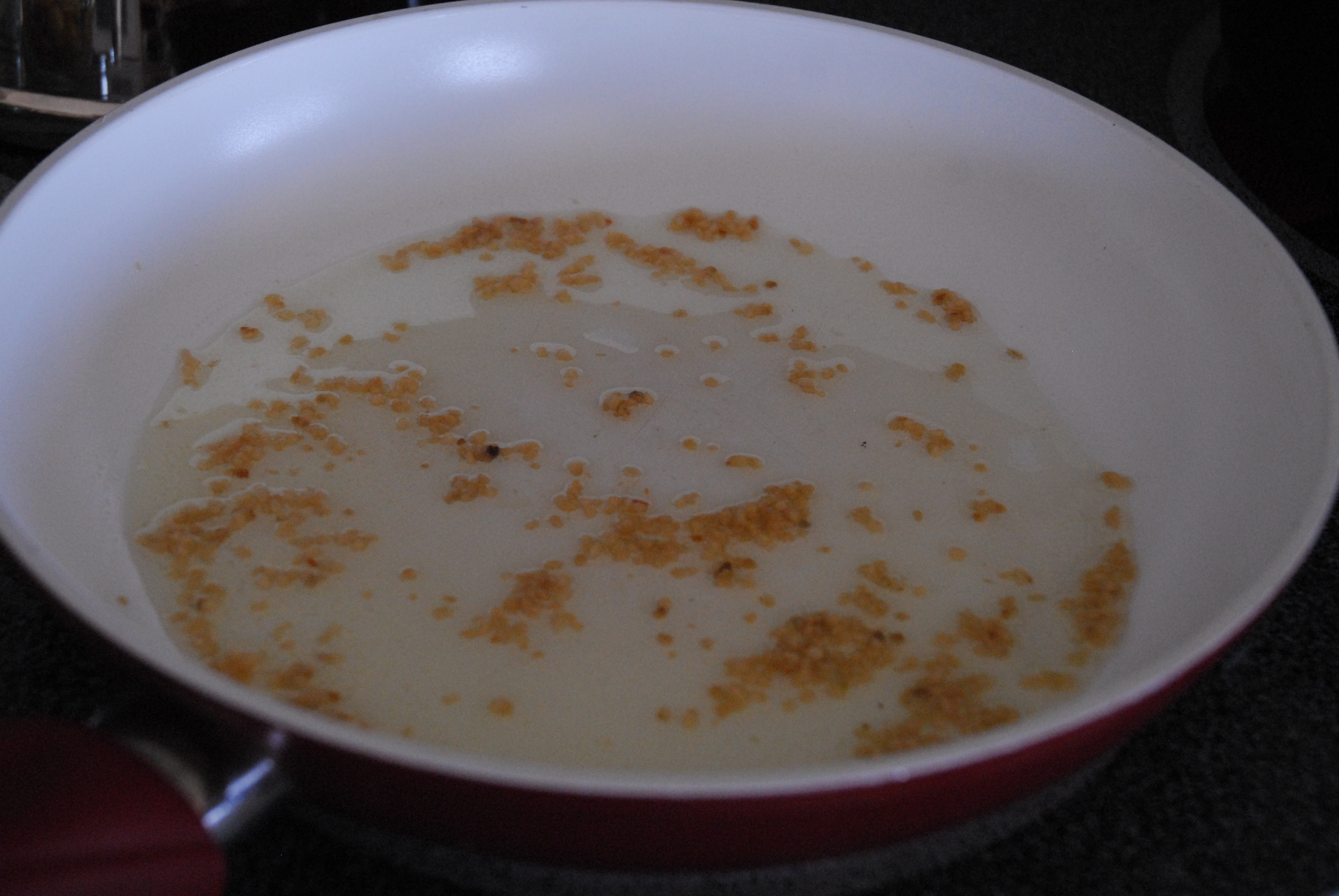 While pasta is cooking, pour olive oil into skillet, add garlic and cook until golden brown.