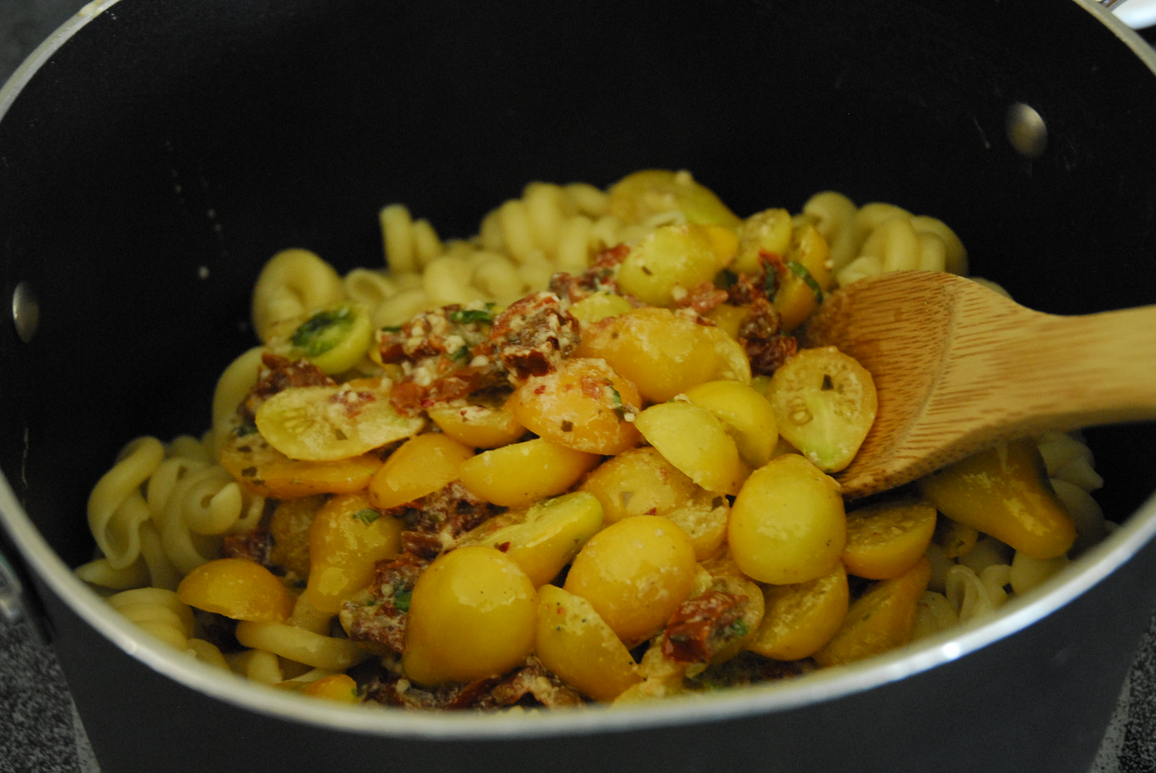 I turned the burner off until the pasta was finished. Once the pasta is cooked and drained, add the yellow tomatoes to the sauce and a dollop of pesto and stir.
