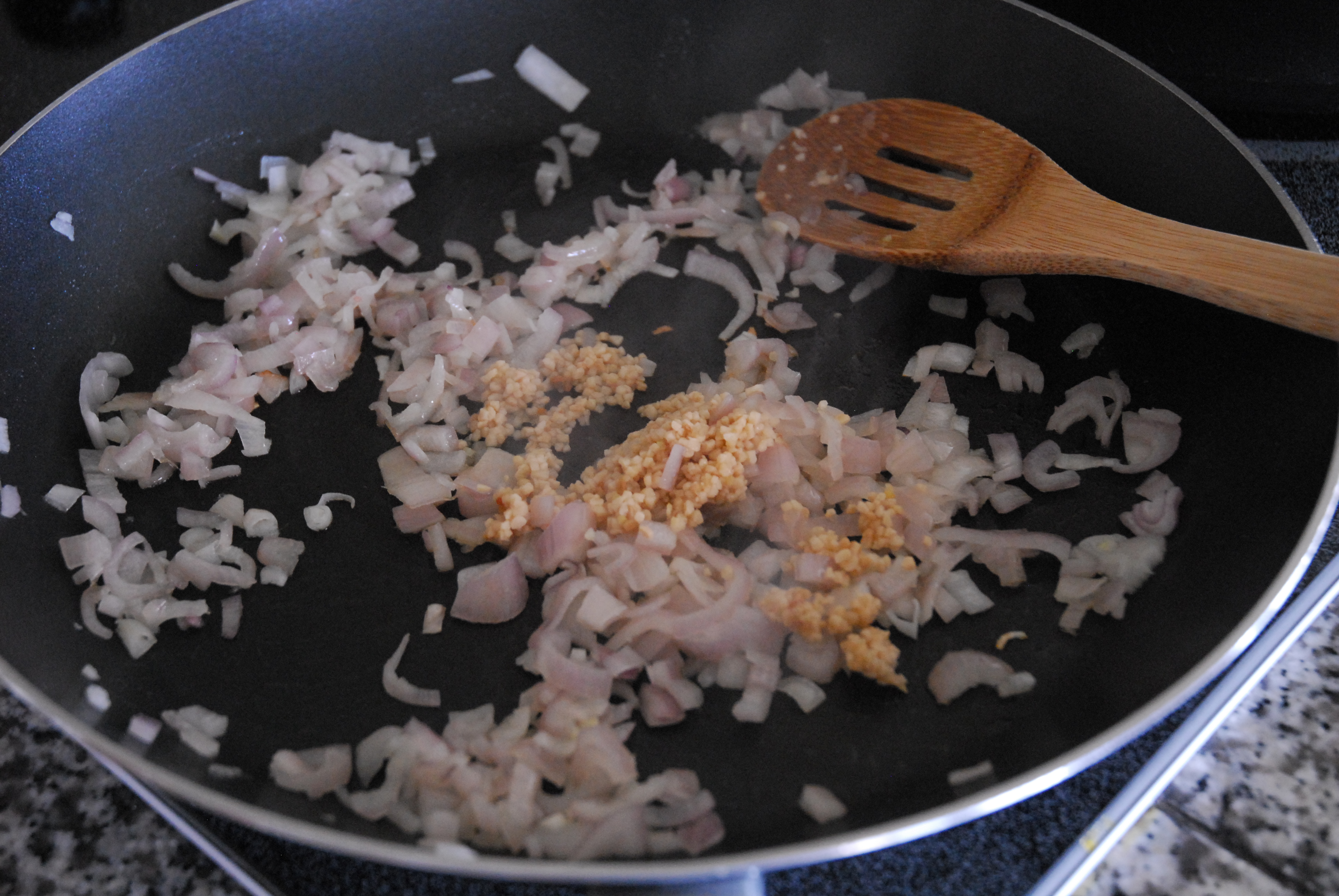 Heat olive oil in a very large skillet over medium heat. Add shallots and saute until translucent, 3-4 minutes, then add garlic and saute for 30 more seconds.