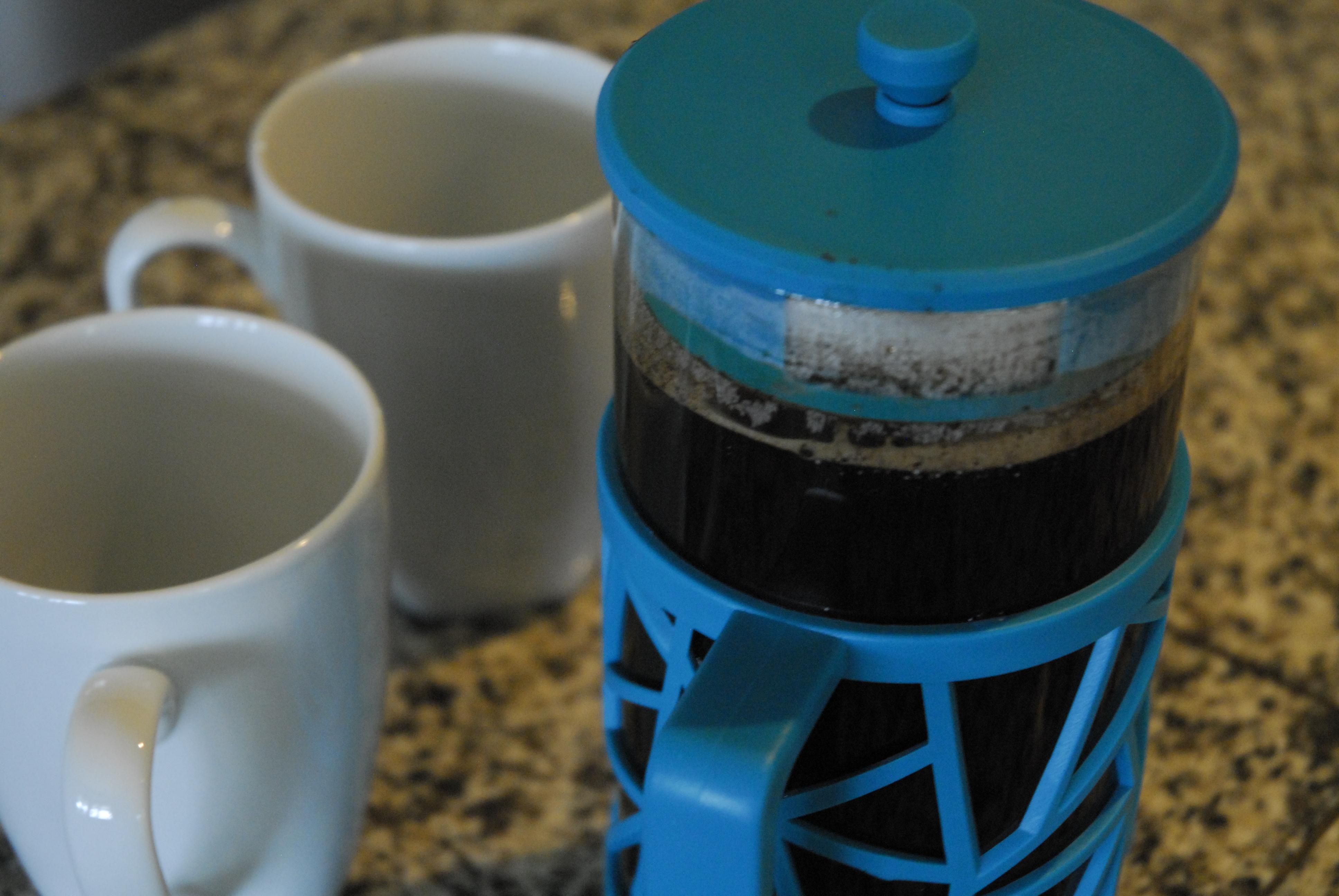 A very long time ago, my friend Laura gave me a wonderful French press. I used it from time to time at home, but I used it all the time while camping. It was awesome! About 2 years ago it broke- so sad! I replaced it with a regular coffee maker and then sort of forgot about it. About a month ago we were in Target looking for dorm room stuff for Travis and came across some adorable, brightly colored French presses. I thought it would be nice to have, but didn’t know if I should get one- I mean really, how many coffee makers does one person need? I think I own 5!