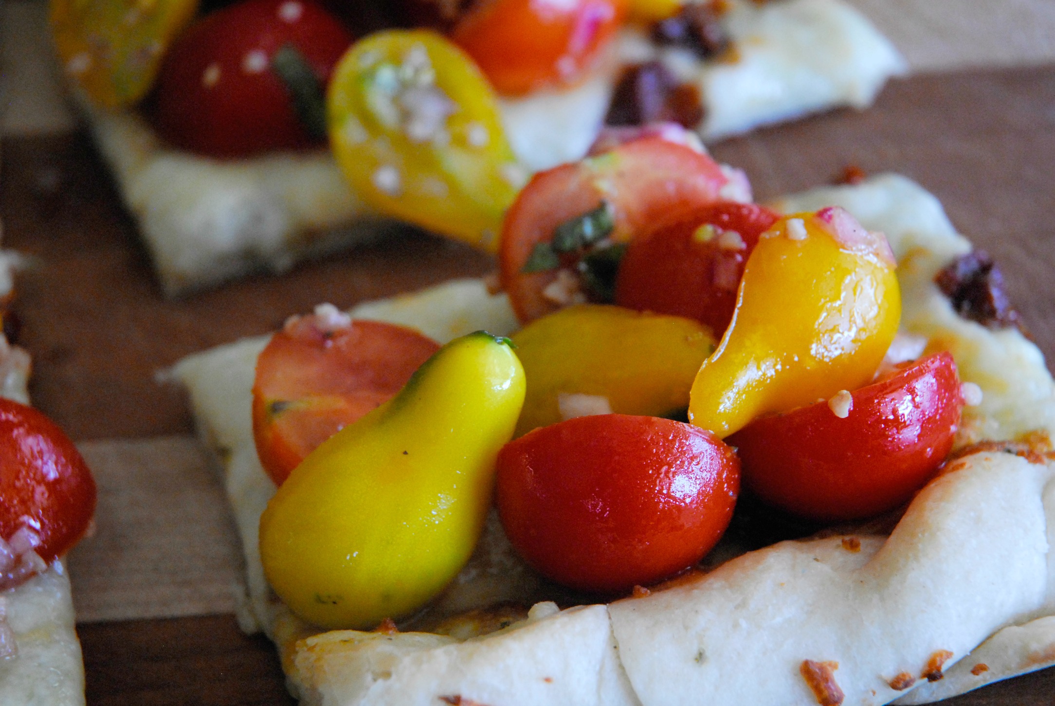 Remove from oven and cut into squares. Let each person spoon on their own tomato-basil salad before eating.