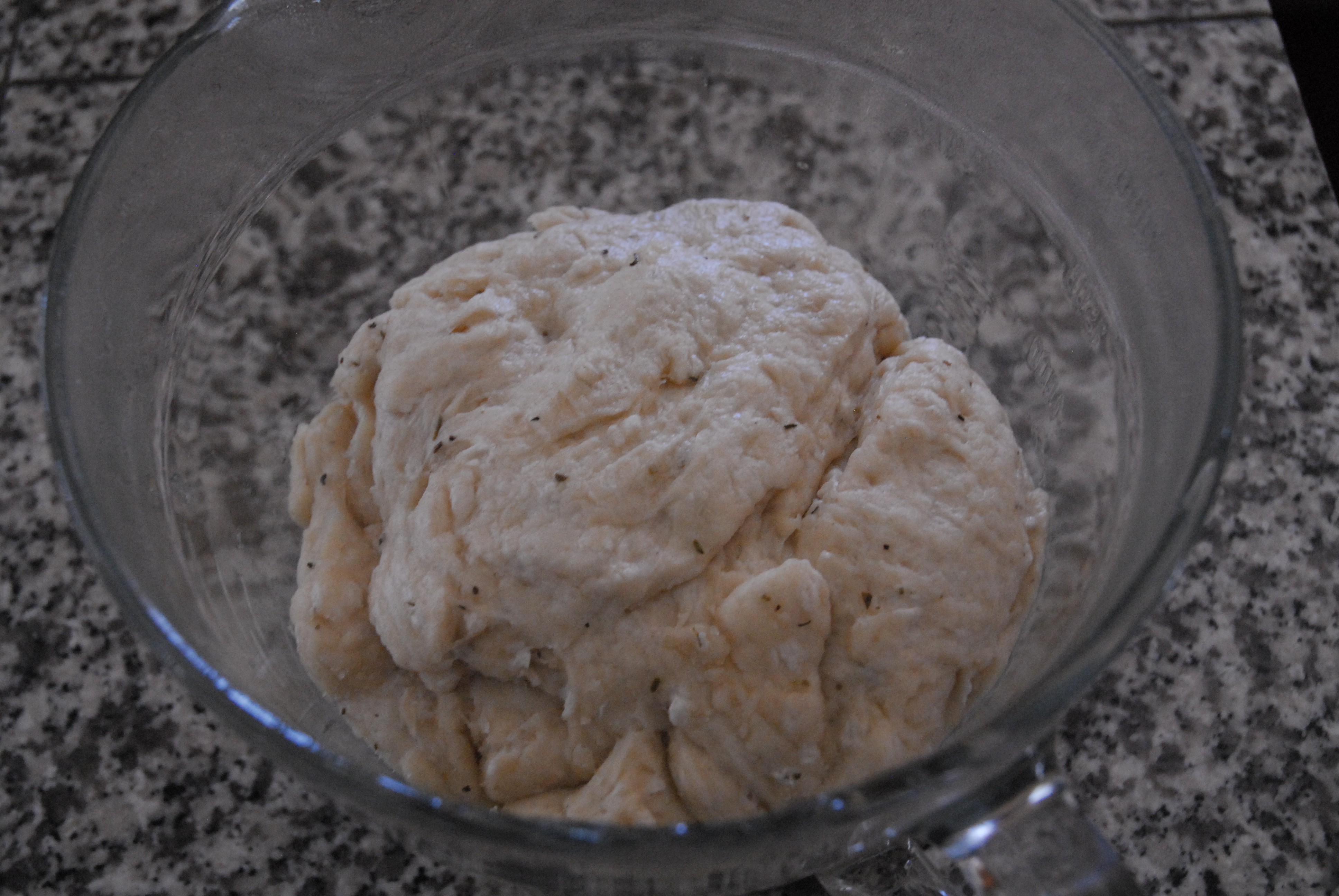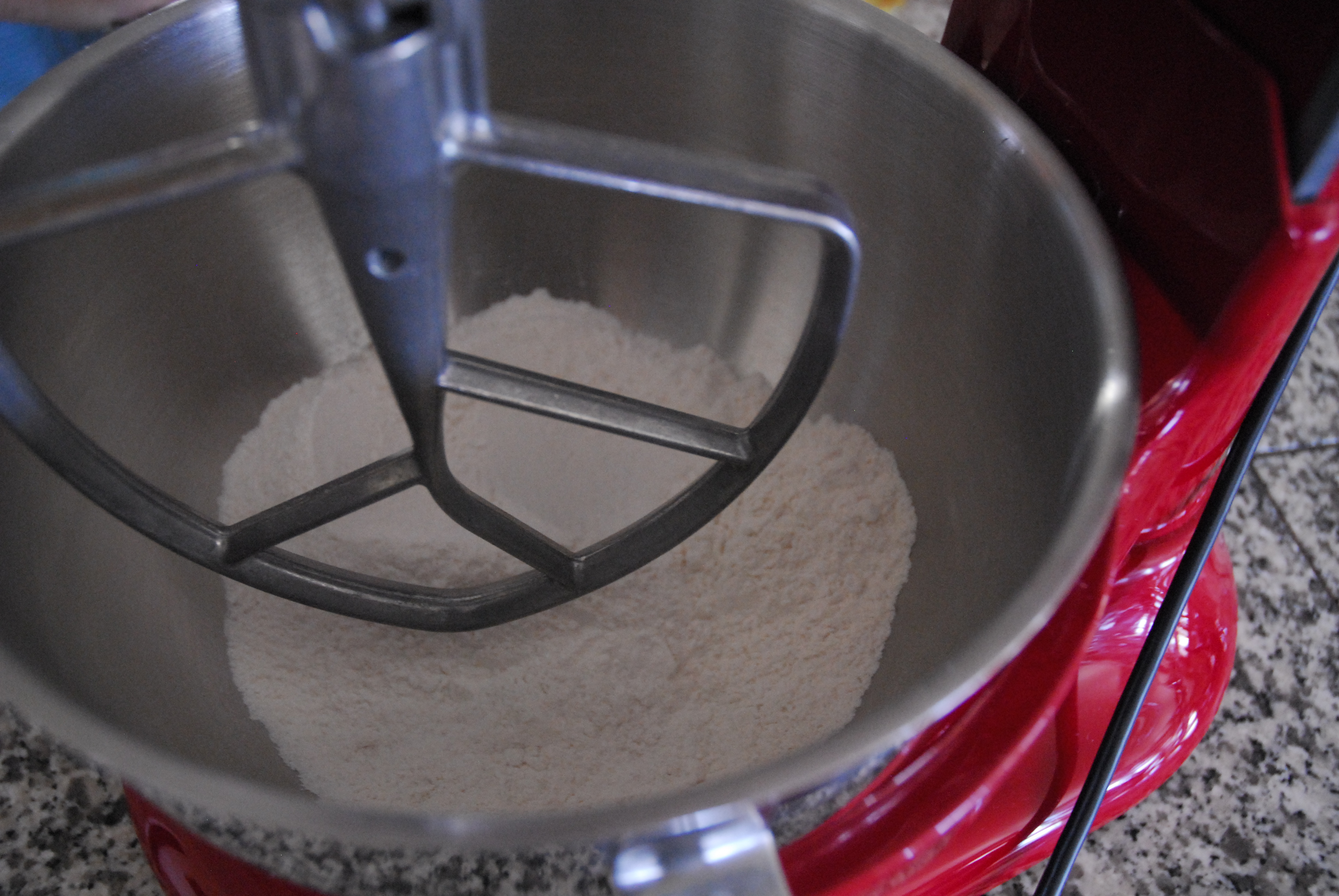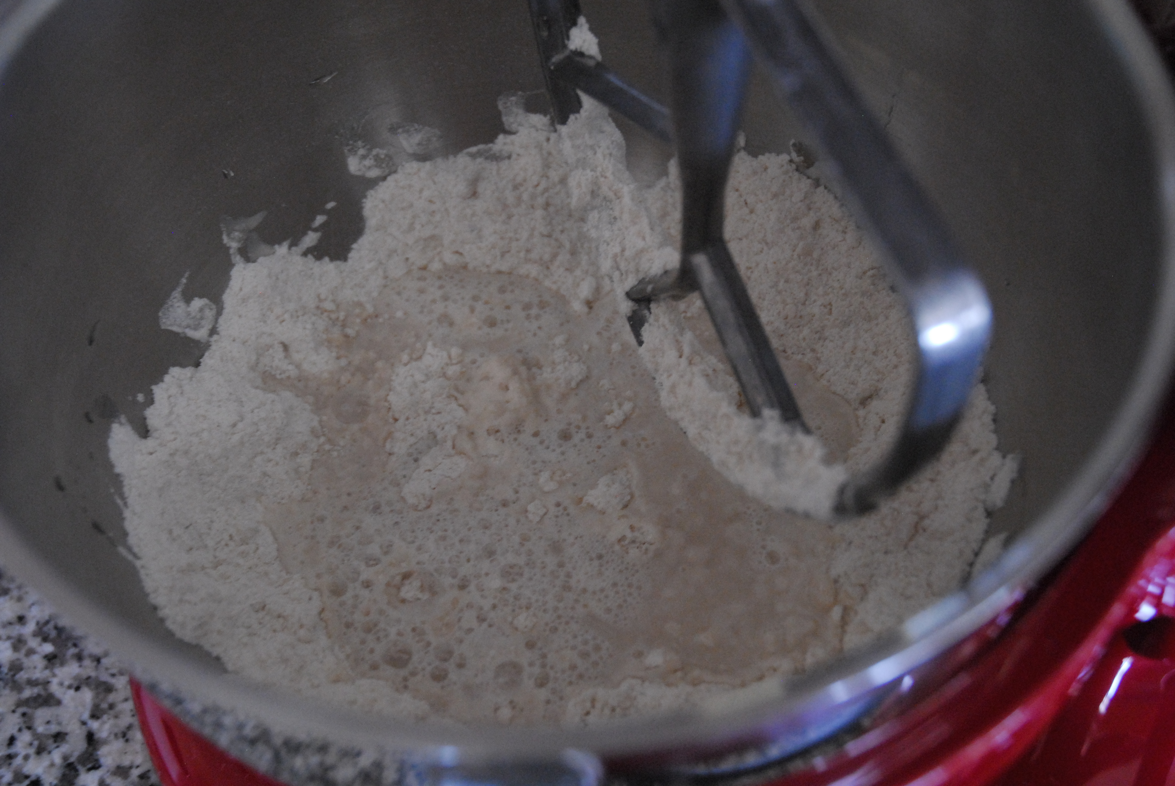 With the mixer running on low speed (with paddle attachment), drizzle in olive oil until combined with flour.