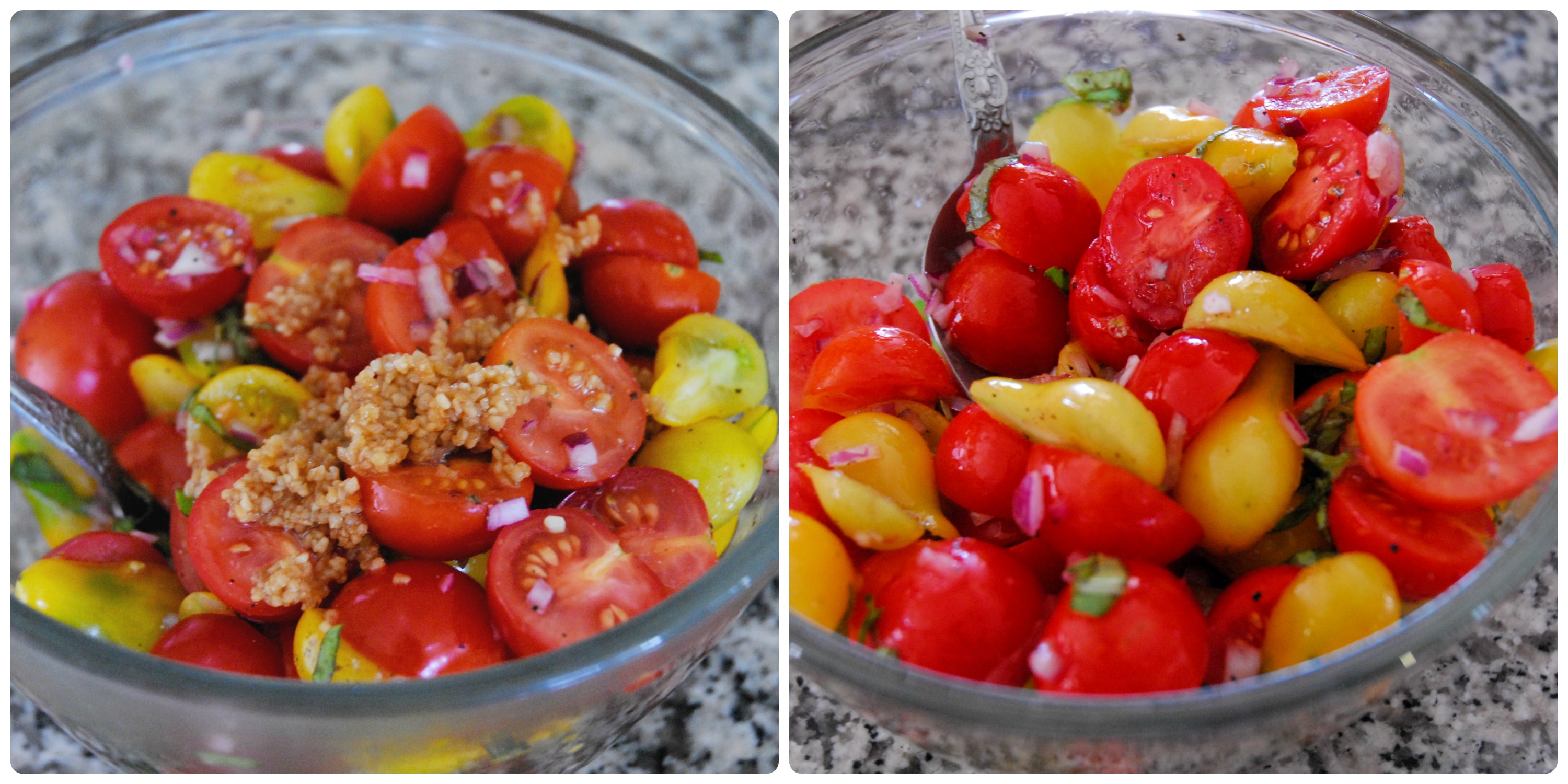 Add tomatoes, balsamic, basil, and salt and pepper to the bowl. Toss to combine, then taste and add more basil if needed, and more salt if needed (don’t oversalt, though!)