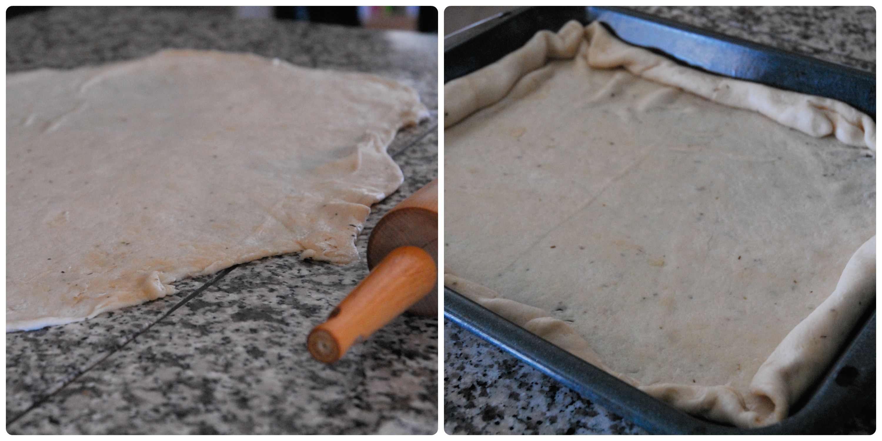 Preheat the oven to 500 degrees. Roll out the pizza dough as thin as it will go and transfer to an oiled baking sheet. Drizzle a little olive oil on the dough and smear it around with your fingers.