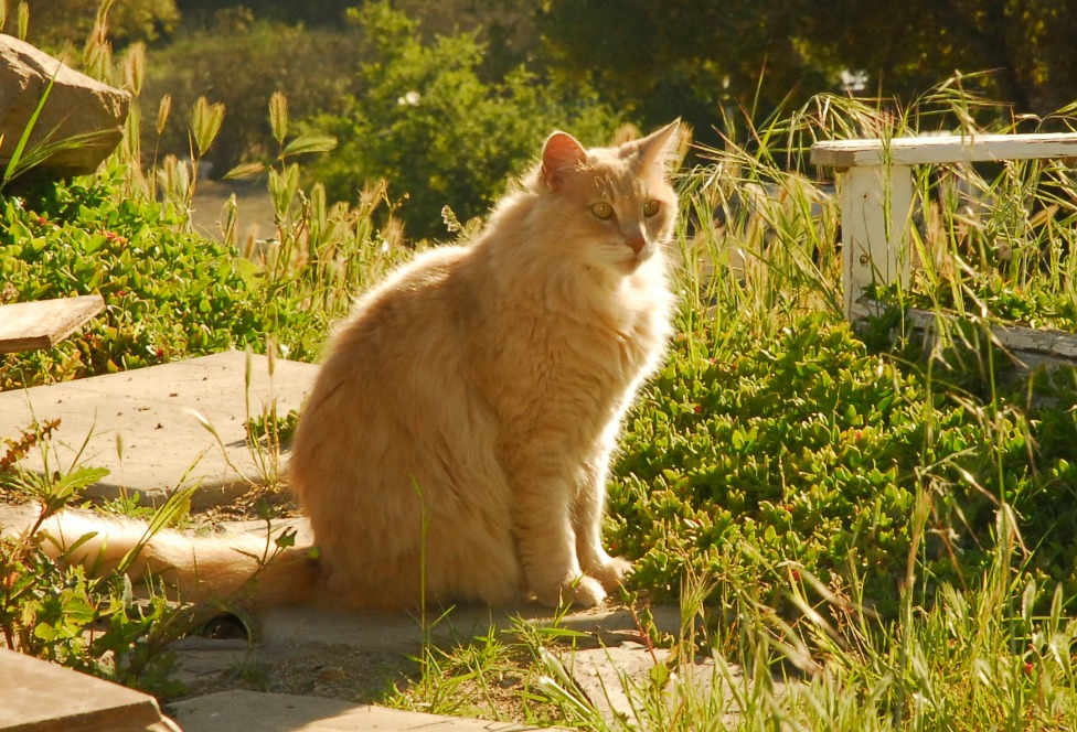 Roofus – the rescue kitty. We rescued him off the roof of a church in town. We noticed him one night crying up on the tall roof. When we went back the next day, he was still there. For a couple of days we tried to coax him down but he wouldn’t come. I started calling and visiting the local fire department to see if they would help me, but they insisted that the cat would come down on his own – “you never find cat skeletons on rooftops do you?” Finally they admitted that they don’t have a hook and ladder truck tall enough to get up there. Next thing you know, they called another nearby station that had a hook and ladder truck and they came over and tried to get him down and he refused, they couldn’t get him. I was desperate and on a mission. I called the equipment rental place and they had a big boom lift, they agreed to bring it over the next morning (if it wasn’t being used by a paying customer), the big rescue was going to occur the next day! Next thing you know, we got a call from the pastor at the church to come get our cat. Apparently he could get down the whole time, he came into the sanctuary where they were having choir practice. He was a mess. Skinny, scared, smelly and a bit psychotic! We put out signs in the area and no one claimed him – so 6 years later we still have Roofus! He is a great cat- he totally thinks that he is a dog.