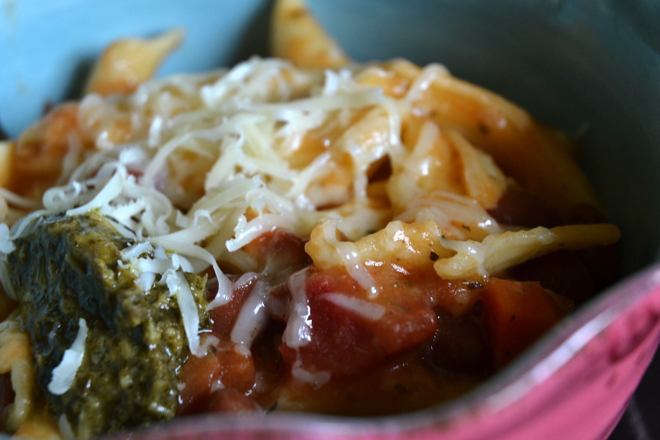 Serve with a bit of freshly grated Parmesan cheese, pesto and basil on top.